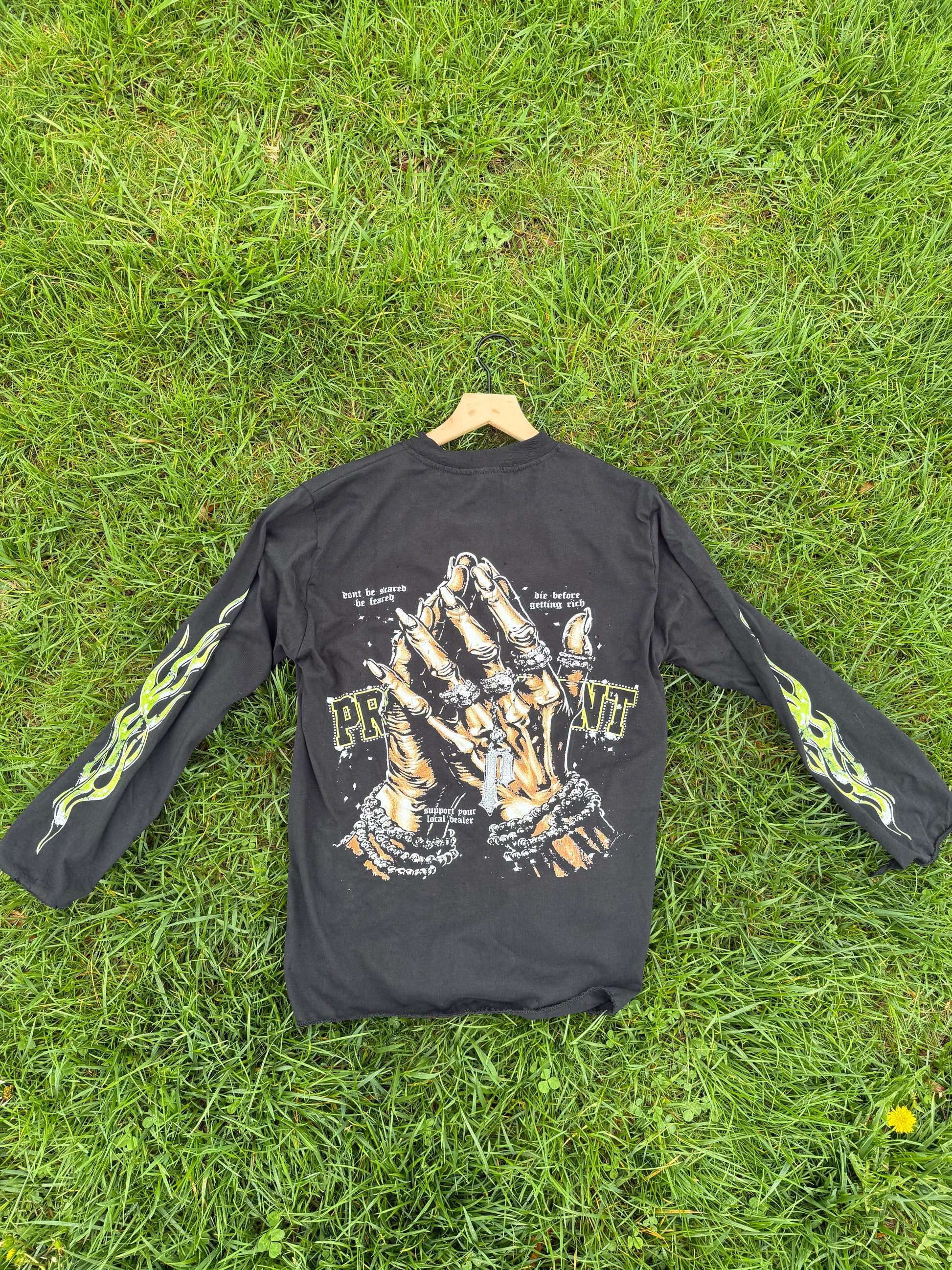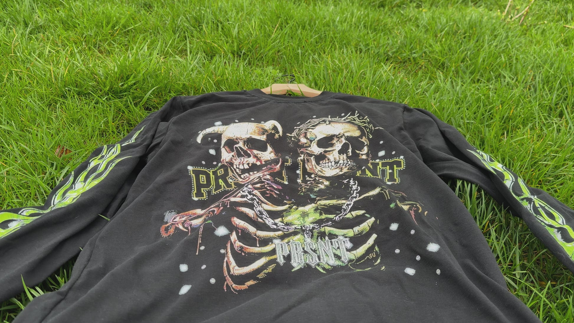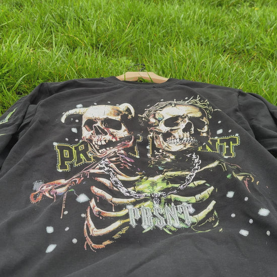 The DEALER SKULLS LS T-SHIRT is made from 100% lightweight cotton and features a bold twin skulls graphic with a "PRSNT" chain, perfect for streetwear enthusiasts. Show your support for your local dealer and never be feared with this fire and unique long sleeve shirt.