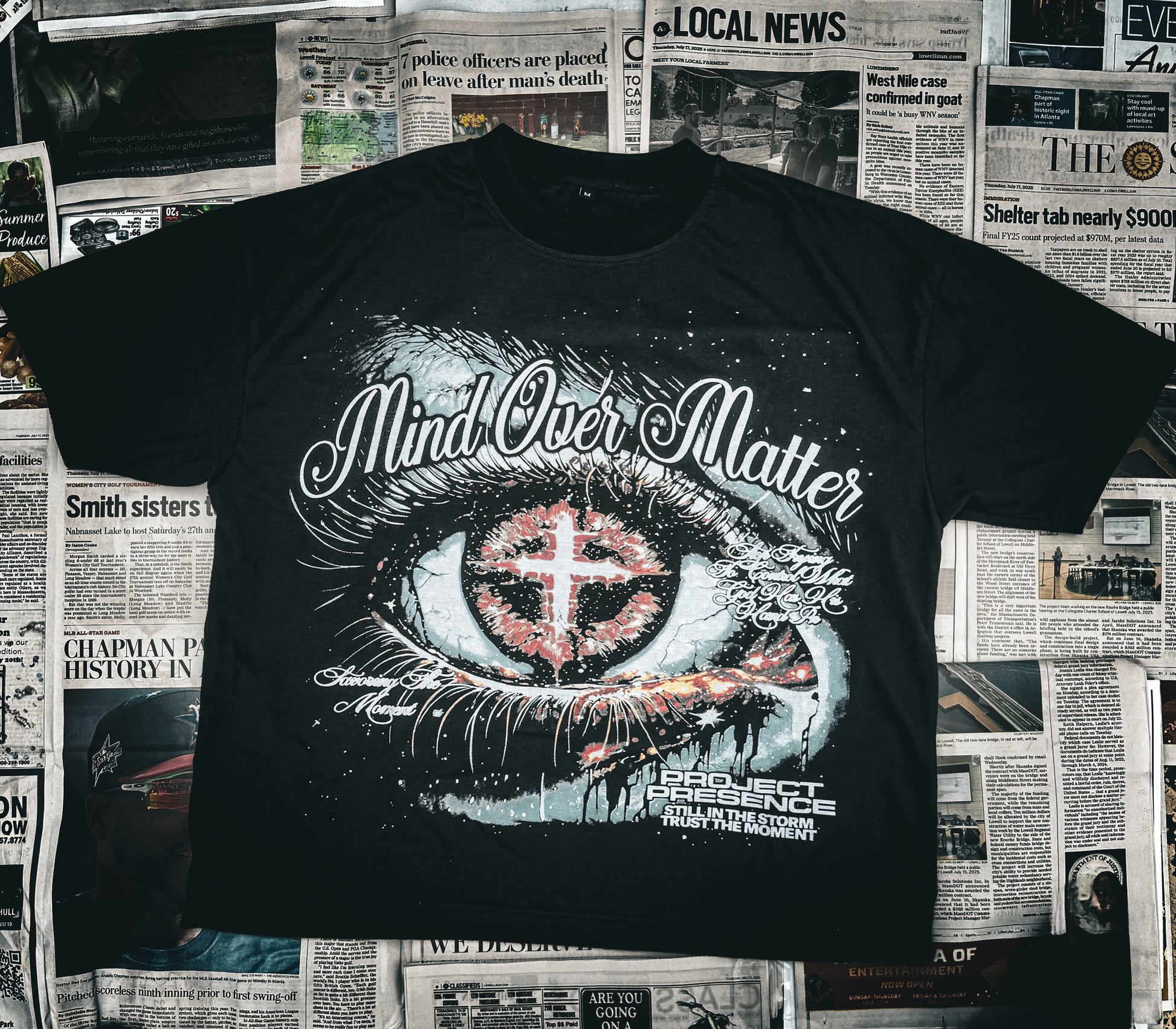 This Mind/Matter T-shirt is crafted from 100% heavyweight cotton for durability and comfort. Featuring a bold God reference graphic on both front and back, it delivers a powerful message of presence and intention. Its boxy crop fit offers a modern silhouette, combining style with statement-making appeal. Ideal for those who appreciate meaningful design paired with quality fabric.
