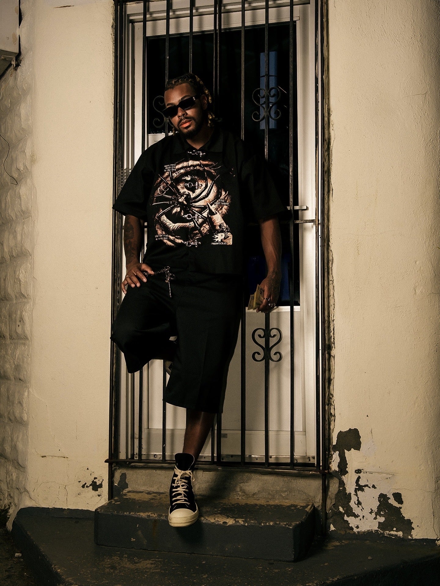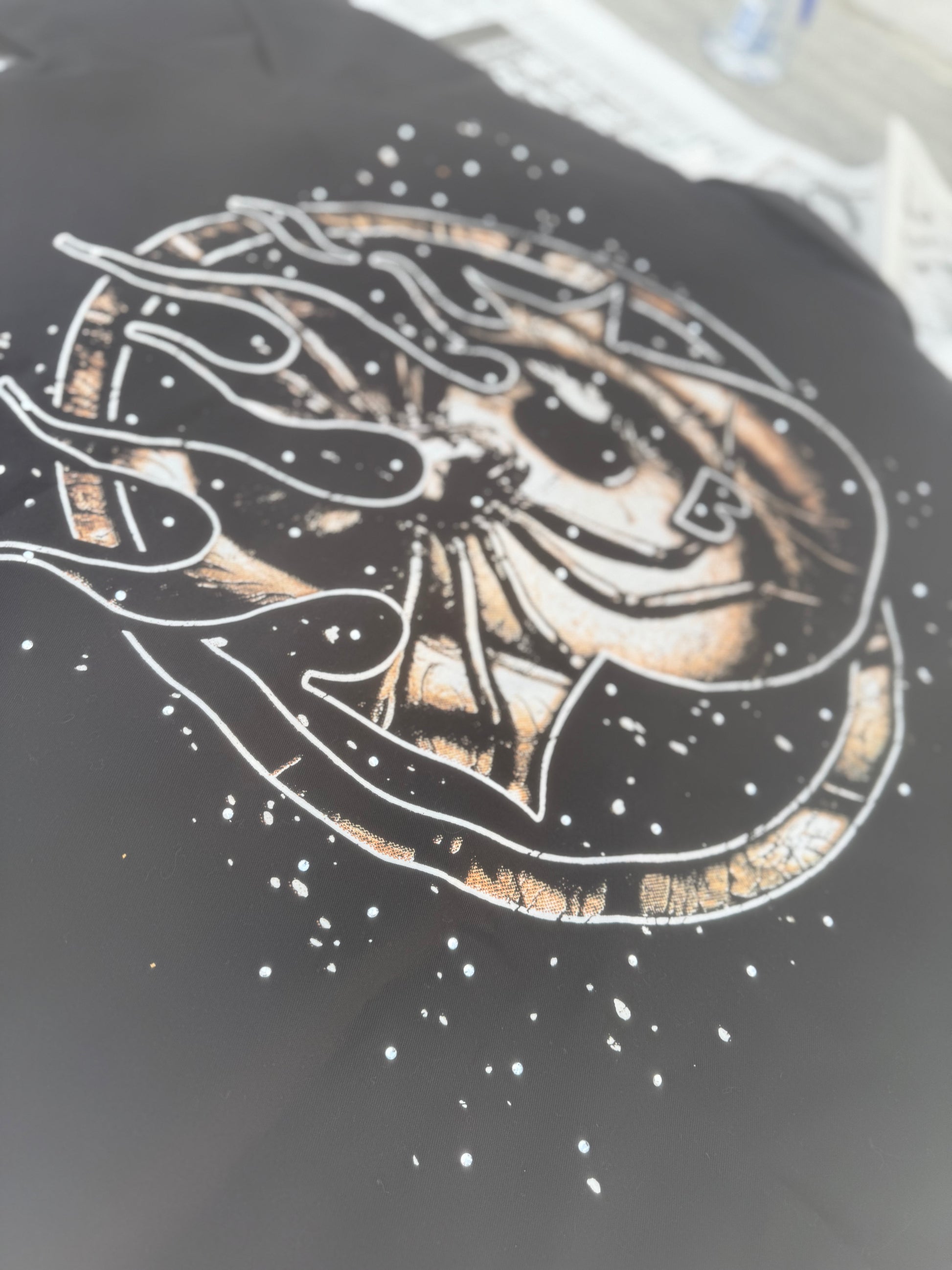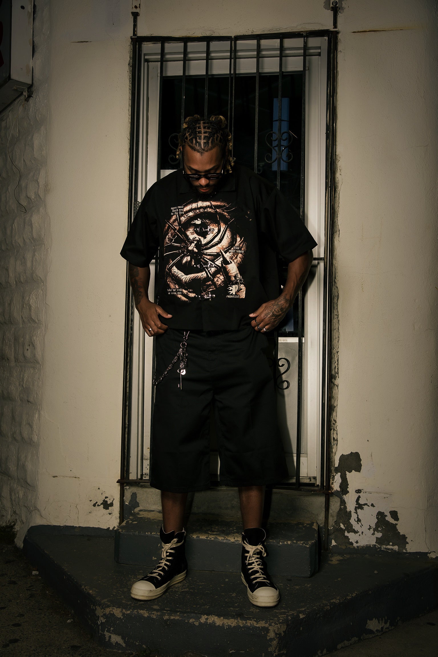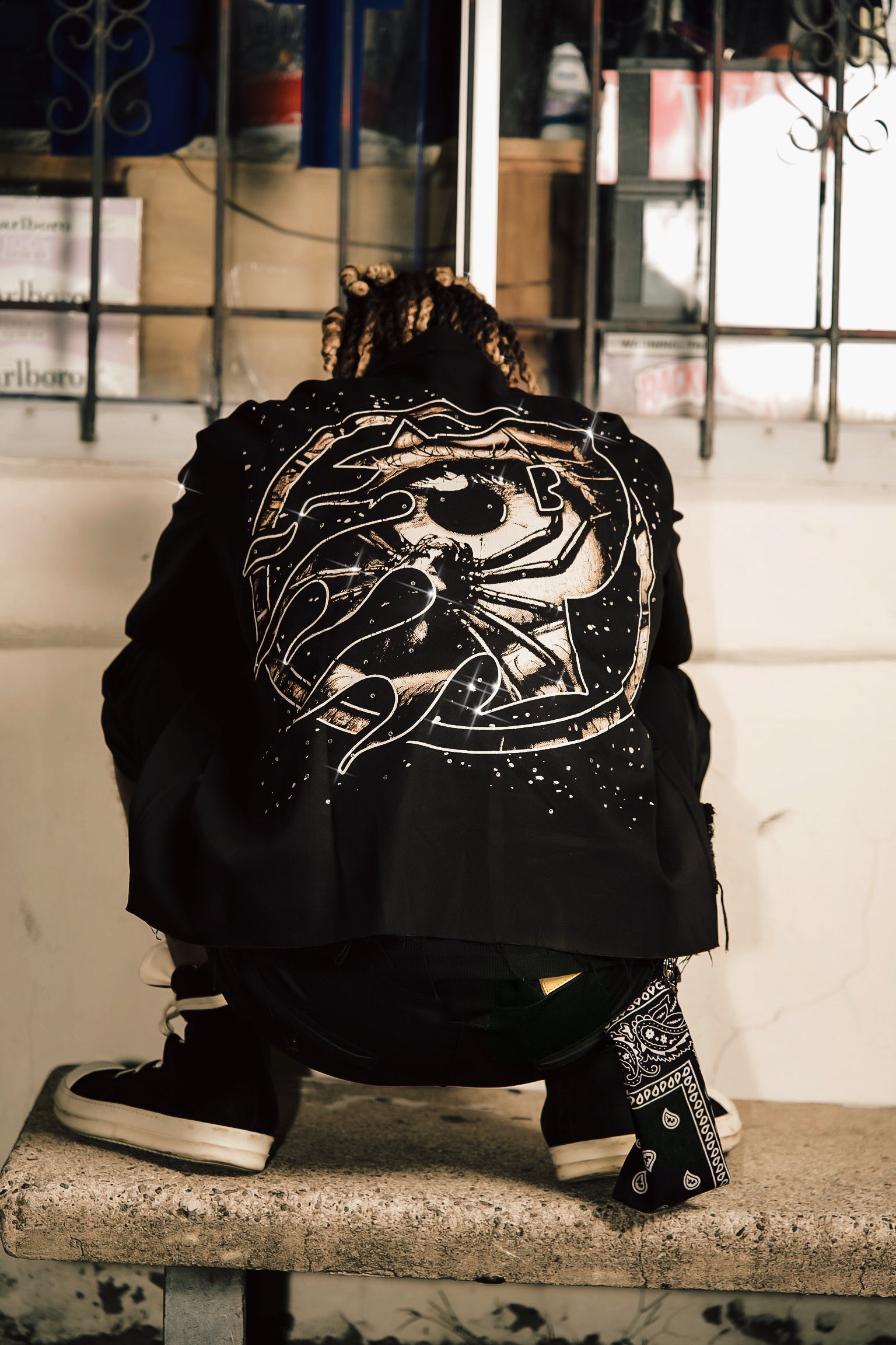 The S4IDER BUTTON UP is crafted from 100% cotton twill, offering a comfortable yet durable fit. It features fire jacket metal clasps on the front for secure closure and a distinctive edge. The eye-catching front showcases a striking spider inside an eyeball graphic, adding unique visual interest. The back is fully adorned with a "P" design embellished with shimmering rhinestones and stars, creating a bold, sparkling statement piece that combines expert craftsmanship with standout style.